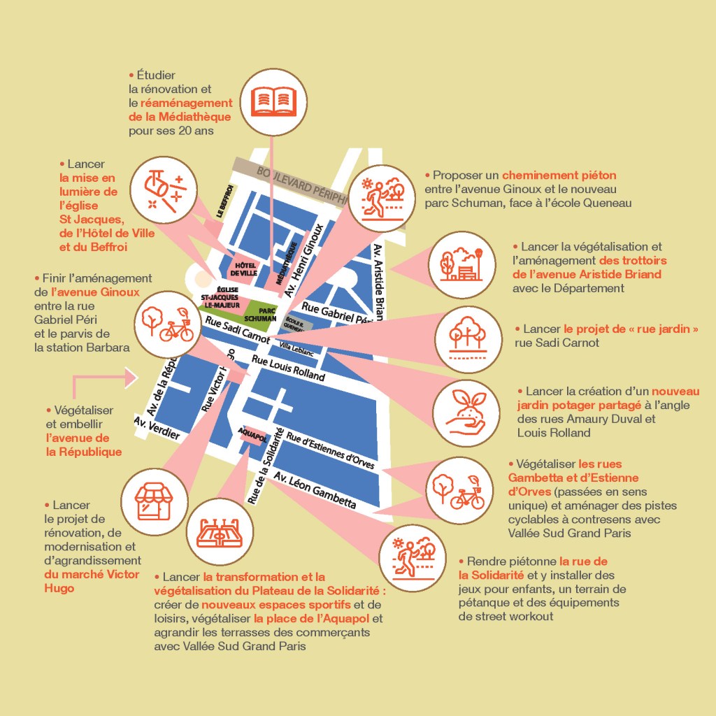 harmonieuse et équilibrée.Nous continuerons à proposer des services proches et accessibles – écoles, crèches, commerces, équipements culturels, sportifs et de loisirs – et à donner la possibilité à chacun de se loger plus facilement et de se déplacer simplement. Nous poursuivrons aussi le verdissement de tous nos quartiers pour les rendre